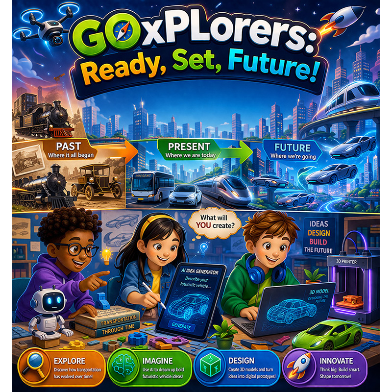 Step into the past, present, and future of transportation! Begin your journey with an exciting visit to uncover how vehicles and systems have transformed over time. Back in the classroom, let your creativity take flight as you harness the power of AI to dream up bold, futuristic designs for tomorrow’s vehicles. Then, bring those visions to life through 3D modeling, turning your imaginative concepts into digital prototypes. This workshop blends exploration, innovation, and hands-on creation — a perfect mix of learning, discovery, and future-thinking!