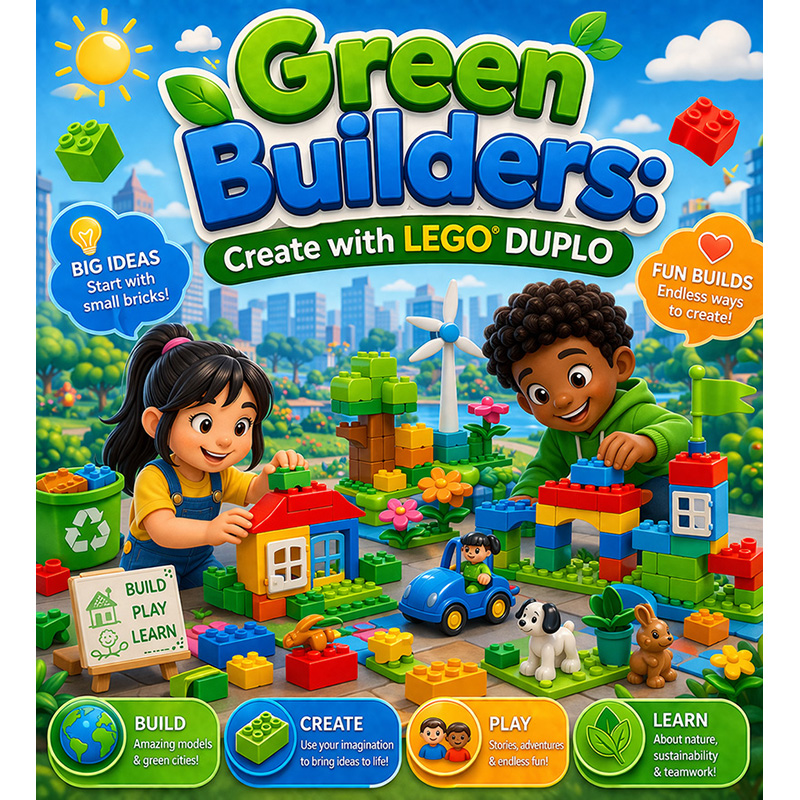 Build a greener future with Green Builders: Create with LEGO DUPLO! In this fun, hands-on workshop, young learners will design and construct their own eco-friendly creations using LEGO DUPLO. Through playful building, they’ll explore simple ideas about sustainability, creative problem-solving, and teamwork while bringing their imaginative green worlds to life.