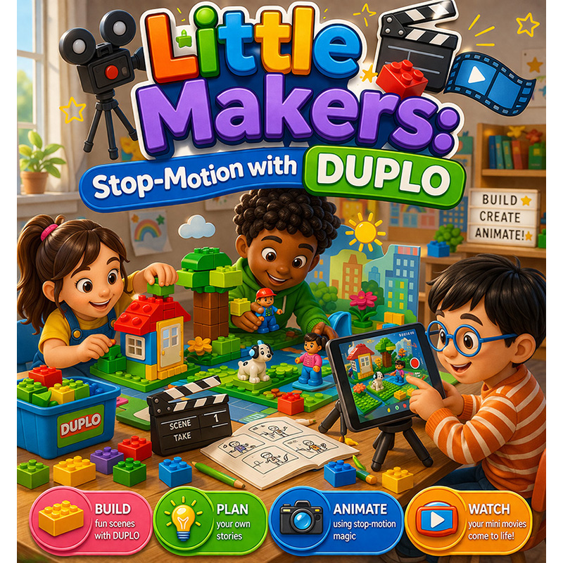 Join us for a fun-filled hands-on workshop where young learners bring their ideas to life through creative building and storytelling! Using DUPLO blocks, they get to design simple scenes, plan their own mini stories, and explore the magic of stop-motion animation. With the help of digital tools, they will capture, edit, and transform their creations into short, animated clips. At the end of the day everyone gets to watch their very own mini movies come to life!